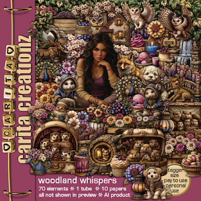 I am featuring a beautiful kit by Carita Creationz called Woodland whispersThis kit 70 elements, 1 tube, 10 papersI used the PU Nikki tube.Not included in the kit.Find it here.https://payhip.com/b/MPL8H